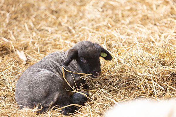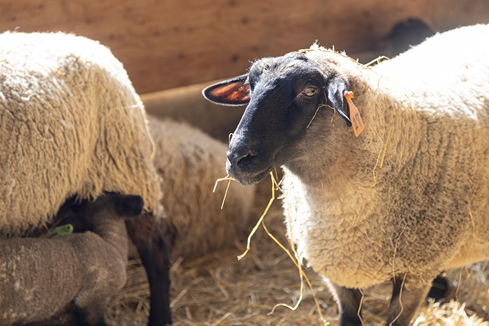 看板の横を通って牧場内に入ると、大きな黒い犬と子犬が自由に走り回っていました。そして聞こえる「メ〜」という鳴き声。畜舎の中に入ると、柵の中には、大小さまざまな羊たちが身を寄せ合っていました。白い体毛に黒い顔と足が特徴の、サフォーク種といわれる羊です。